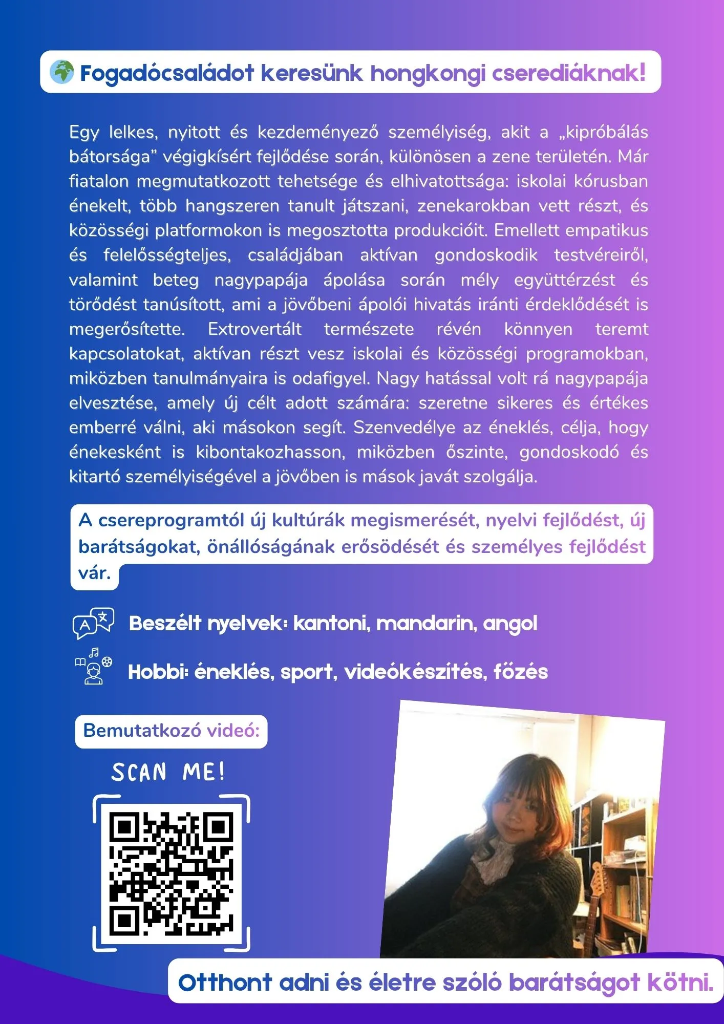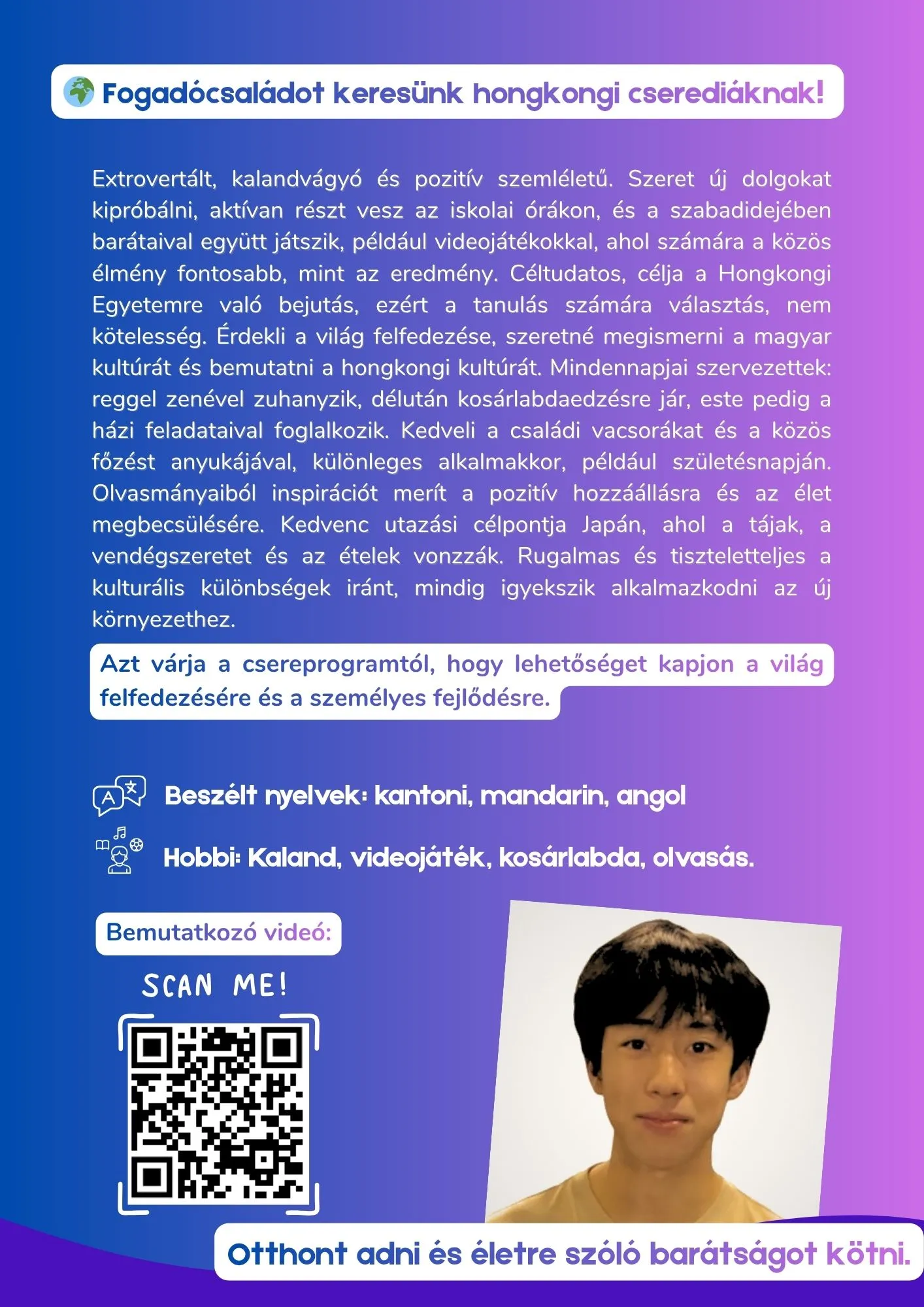 Folyamatosan keresünk szerető fogadócsaládokat a hazánkba érkező külföldi cserediákoknak.