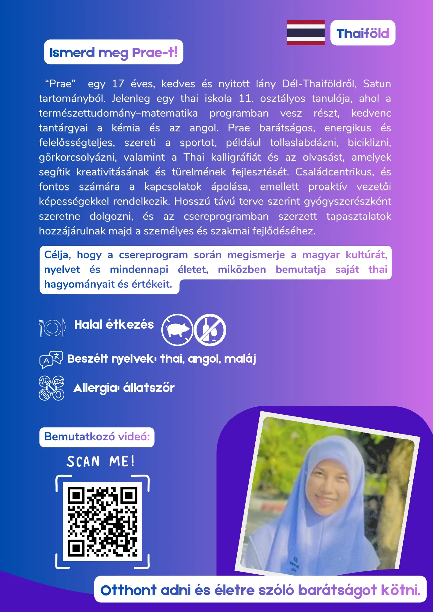 Becenevén Nat egy 16 éves, nyitott és életvidám thai diák. Szenvedélye a rajzolás, a divattervezés és a természetjárás. Már magyarul is tanul, célja, hogy beilleszkedjen a helyi családi életbe, miközben megosztja thai kultúráját és kreatív személyiségét fogadócsaládjával.